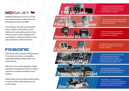 We are FOXKPC Technology Inc., operating under the brands IKD INKJET & FOXKONIC, specializing in industrial marking and inkjet solutions. As the official Asia-Pacific representative of Inkdustry GMBH (Germany), we deliver advanced, reliable, and durable marking technologies trusted worldwide.