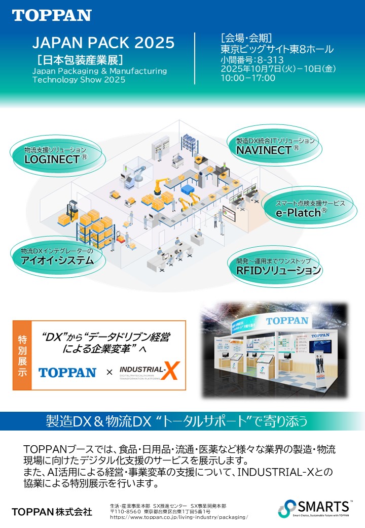 TOPPANブースでは、食品・日用品・流通・医薬など様々な業界の製造・物流現場に向けたデジタル化支援のサービスを展示します。また、AI活用による経営・事業変革支援に関してINDUSTRIAL-Xとの協業による特別展示を行います。