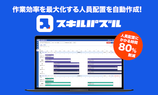 生産計画、スキル、資格、勤務情報などをもとに、AIが作業員の最適な組み合わせを提案する現場特化型の人員配置ツールです。業務の属人化を防ぎ、生産性の最大化やスキルマネジメント、エンゲージメント向上にも貢献します。