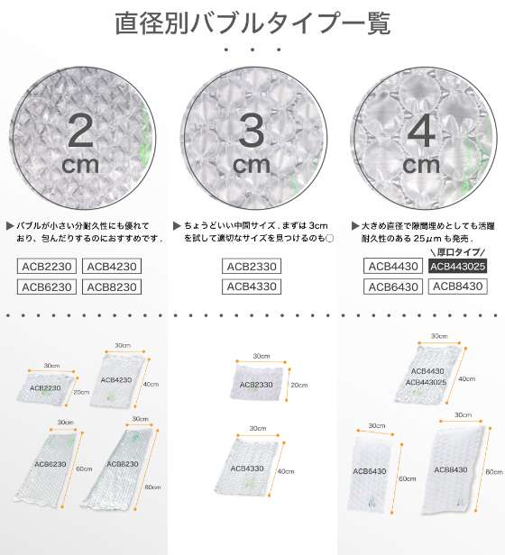 専用本体「エアークッションメーカー」で製作できる、環境にやさしいリサイクル材を使用したエアー緩衝材です。すき間埋めに使いやすいピロー型と、包み込めるバブル型も。ご使用状況にあったサイズからお選びいただけます。