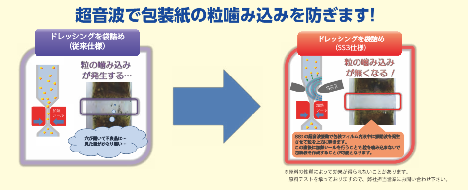 横シールする直前に超音波にて内容物をはじきながら原料をしごき上げることにより嚙み込みが激減。